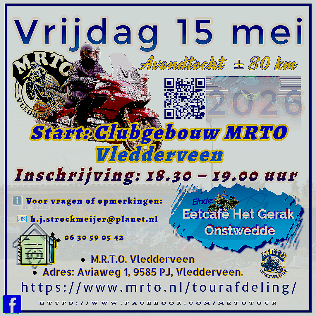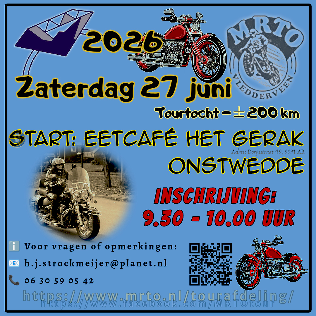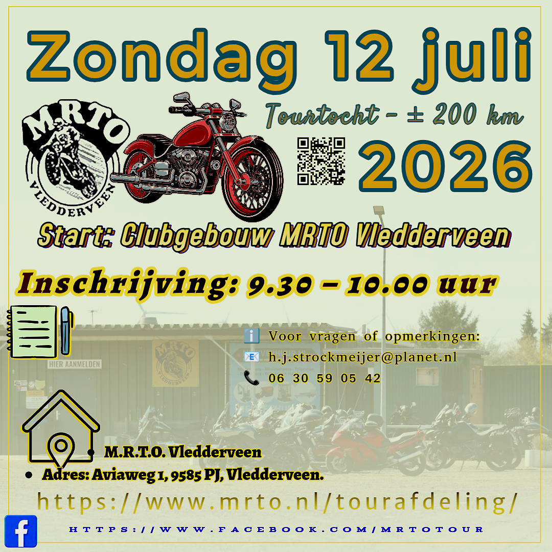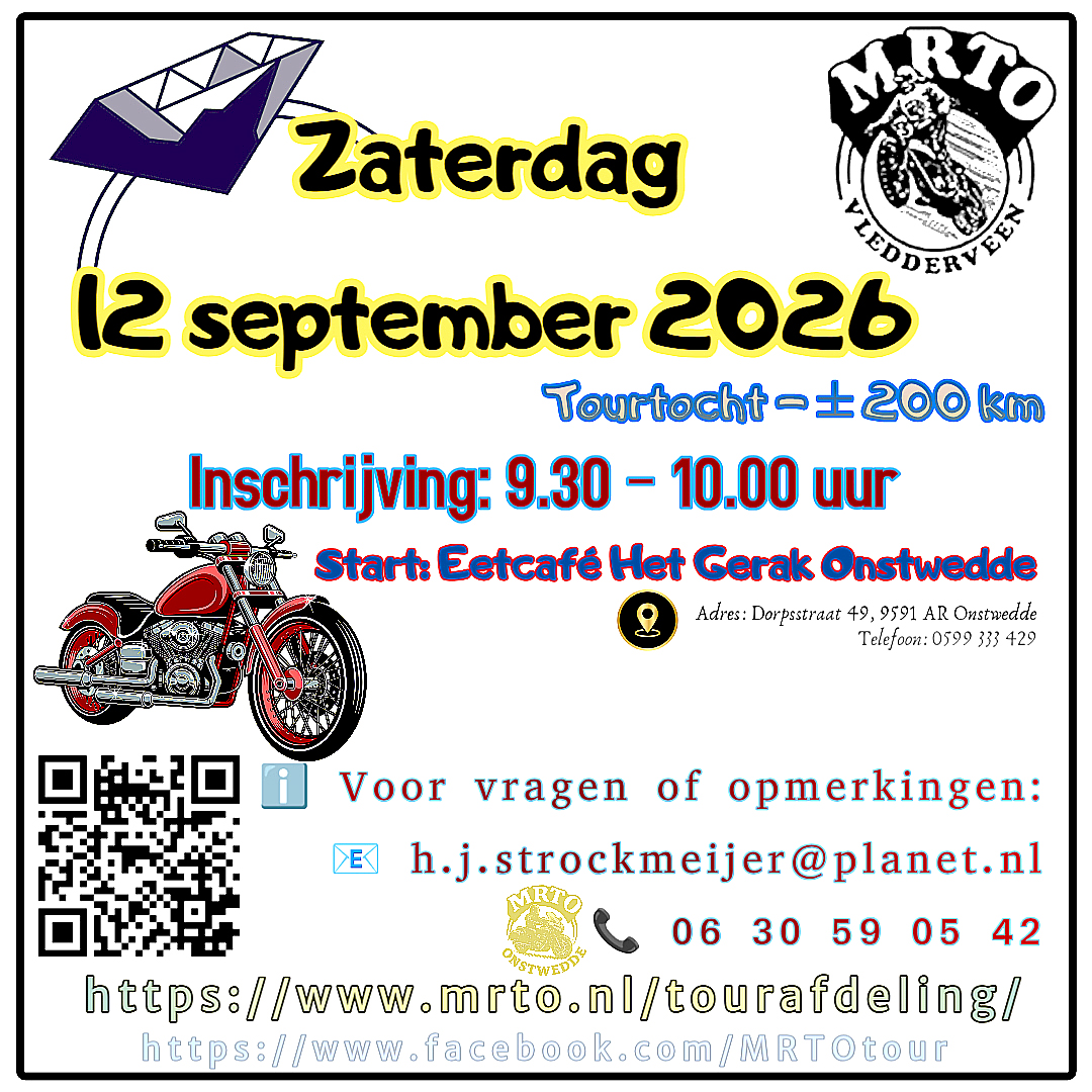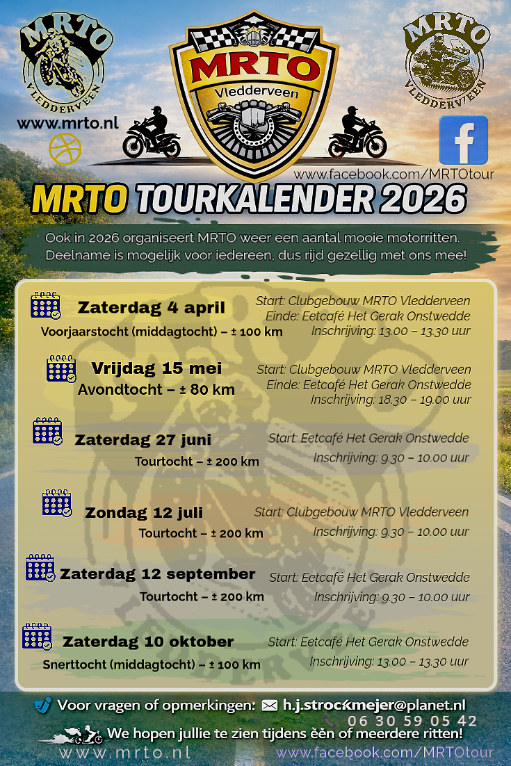 Vledderveen / Onstwedde – In 2026 pakt MRTO opnieuw uit met een gevarieerd programma aan motortochten. De Tourkalender 2026 telt zes ritten, verspreid van april tot en met oktober. Deelname is mogelijk voor iedere motorrijder – lid of geen lid – die graag in groepsverband geniet van mooie routes en gezelligheid.