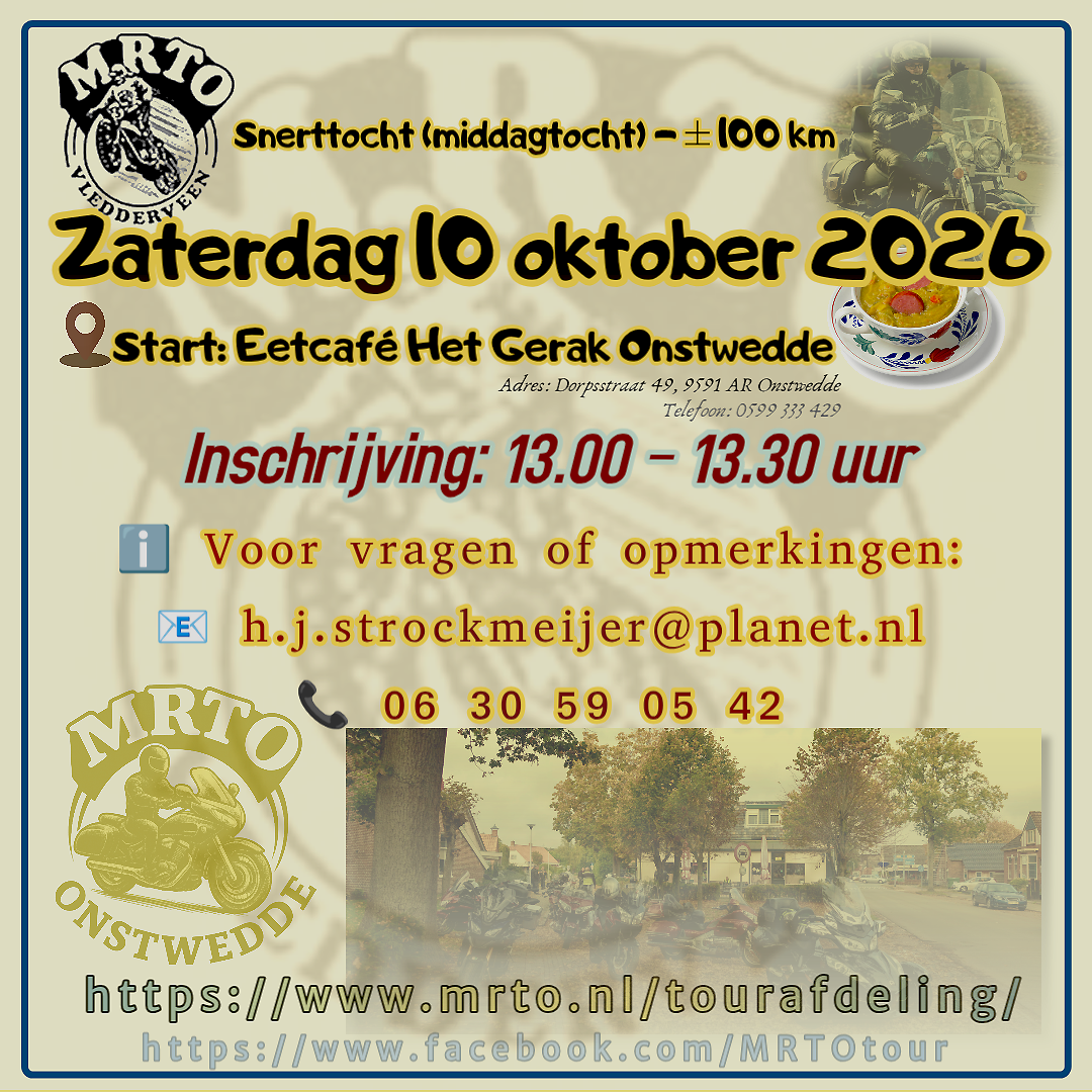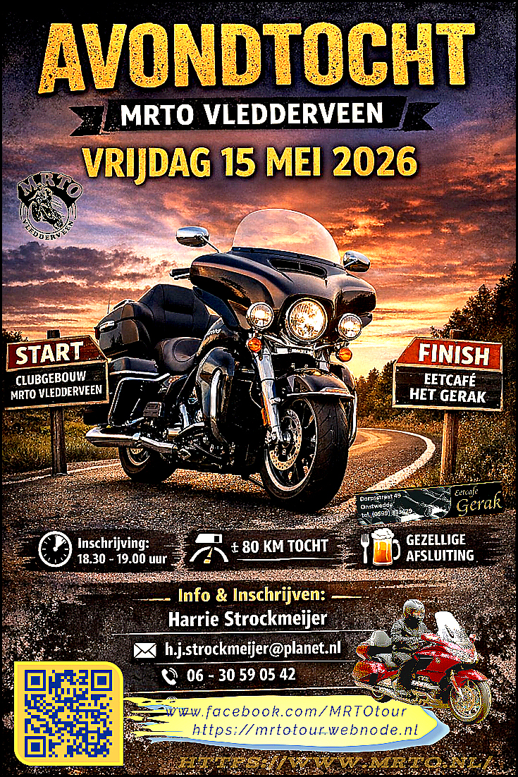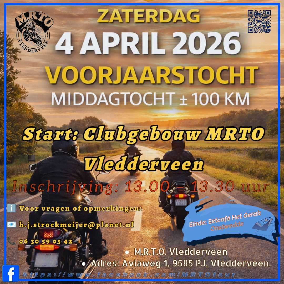 VLEDDERVEEN / ONSTWEDDE – Motorliefhebbers kunnen hun agenda alvast markeren: op zaterdag 4 april 2026 opent Motor Racing Team Onstwedde (MRTO) het nieuwe motorseizoen met een voorjaarstocht van circa 100 kilometer. De middagrit vormt de officiële aftrap van het toerprogramma 2026.
