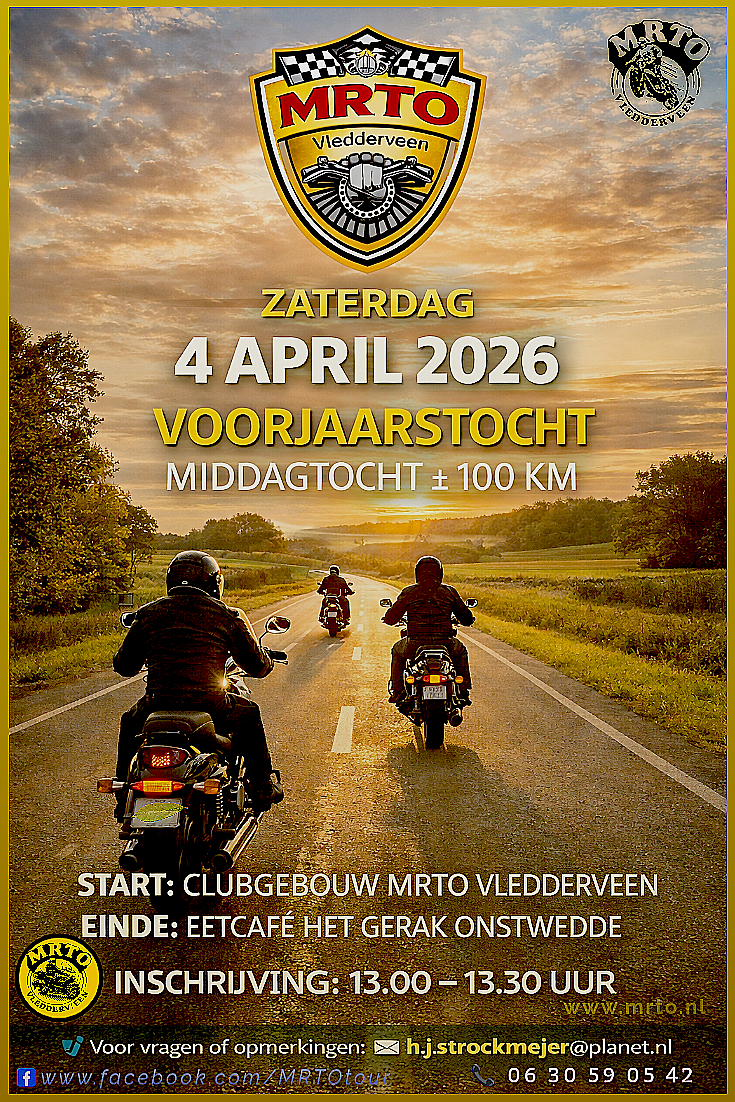 VLEDDERVEEN / ONSTWEDDE – Motorliefhebbers kunnen hun agenda alvast markeren: op zaterdag 4 april 2026 opent Motor Racing Team Onstwedde (MRTO) het nieuwe motorseizoen met een voorjaarstocht van circa 100 kilometer. De middagrit vormt de officiële aftrap van het toerprogramma 2026.